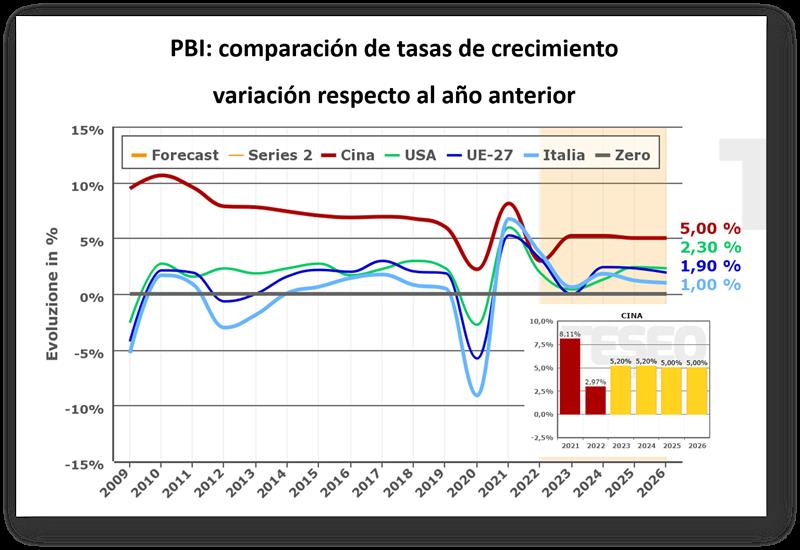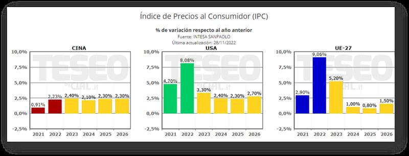 Precios al consumidor y PBI Mundial 29/11/2022Durante el año 2022, el Índice de Precios al Consumidor (IPC) de los países occidentales marcó fuertes incrementos, incluso superiores al +8%, registrando el crecimiento de la inflación. ¿Qué esperar del futuro? Las previsiones para los próximos años indican una tendencia más moderada, a partir de 2023, para el que, sin embargo, en varias áreas, incluida Europa, la inflación se espera en cualquier caso en niveles sostenidos en comparación con los niveles históricos. En Italia se estima una variación del +8,6% para 2022, mientras que para el próximo año la previsión actual sitúa el índice de precios al consumo en el +7,5%. El sector que más ha subido, entre los más influyentes considerados en la canasta, es el relativo al Hogar, facturas de servicios y combustibles, tema candente en los últimos meses. También crecieron los rubros relacionados con Transporte y Alimentos. El ritmo de crecimiento del Producto Bruto Interno (PBI) registró una ralentización durante 2022 que también debería continuar el próximo año, tanto en EE.UU. como en los países de la UE. Tendencia diferente para China que, tras una moderada reducción registrada en 2022, debería estabilizarse ya en 2023, aunque no se espera un ritmo de evolución comparable al registrado en la década pre-covid. ![]() ![]() traducido y extractado por el OCLA del newsletter de Clal.it por Elisa Donegatti