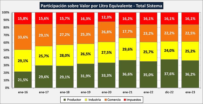 La participación del productor en el total del sistema fue para enero de 2023 del 36,2%, 1,4 puntos por debajo del mes anterior, bastante por encima de la media del 31,8%. Una disminución de 1 punto en los valores finales de mercado interno y una caída de 3,3 puntos porcentuales en la participación de los valores de mercado externo, colocándola 1,3 puntos por debajo de la media histórica de la serie disponible (64,1%). La participación del productor sobre el valor de salida de fábrica (precio al que vende la industria) fue de 59,0%, 2 punto debajo del mes pasado y 5,6 puntos encima del promedio de la serie (53,4%). Recordamos que el mes anterior la participación del productor sobre exportaciones, fue la más alta de la serie. Cabe recordar que la serie histórica para los valores de salida de fábrica tiene una mayor extensión temporal que el resto.