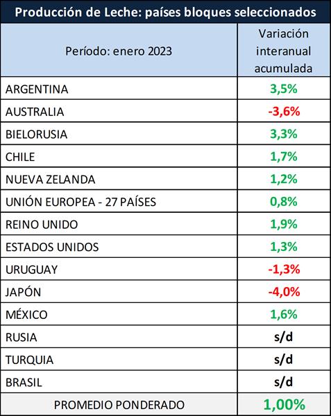 En el cuadro siguiente se toma un grupo seleccionado de los principales países que representan alrededor del 55% de la producción mundial de leche de vaca, en el cual se puede observar un incremento de la producción del 1,0%, para enero de 2023 respecto a igual mes del año 2022.