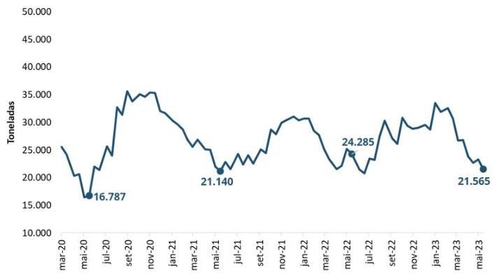 También se observó un retroceso en relación al volumen negociado. Con una caída de 7,3% , el volumen total negociado se ubicó en 21.565 toneladas de productos lácteos, el volumen más bajo observado desde la subasta de julio de 2022, como se muestra en el gráfico 2.