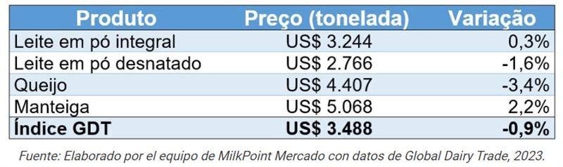 Otro producto que también se desvalorizó fue la leche en polvo descremada , que tuvo una caída de 1,6% al cotizarse a un promedio de US$ 2.766/tonelada. La leche entera en polvo y la manteca continuaron apreciándose , con un avance de 0,3% y 2,2%, los productos se negociaron a un promedio de US$ 3.244/ton y 5.068/ton, respectivamente, renovando la manteca el nivel más alto de negociación en la GDT en 2023, hasta ahora.