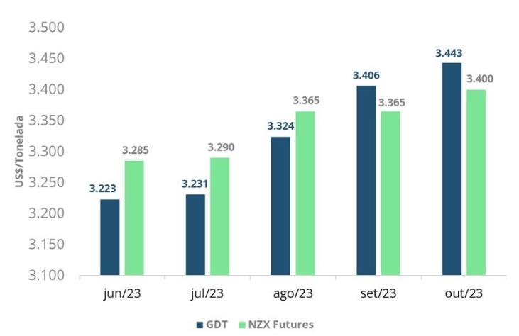 En cuanto a los contratos de futuros de leche en polvo entera, hubo continuidad en los avances de los contratos con vencimiento más cercano, como junio, julio y agosto, tanto en la propia plataforma GDT como en la Bolsa de Valores de Nueva Zelanda (NZX), sin embargo, en hubo una discrepancia entre los movimientos observados para los contratos con vencimientos más distantes, con los futuros GDT experimentando ganancias sutiles, mientras que los contratos NZX experimentaron pequeños retrocesos. El gráfico 4 muestra cómo fueron estos contratos el último día 16.
