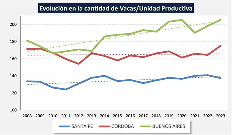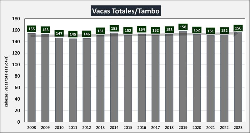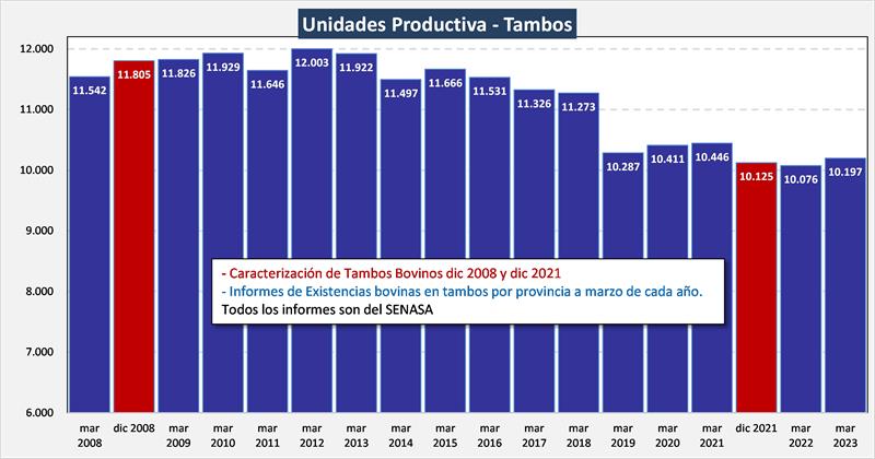 En base a la “Distribución de Existencias Bovinas en Establecimientos con actividad de tambo por categoría” que anualmente elabora el SENASA (al 31 de marzo), se toman las unidades productivas (tambos) y la cantidad de vacas en producción (vaca total).