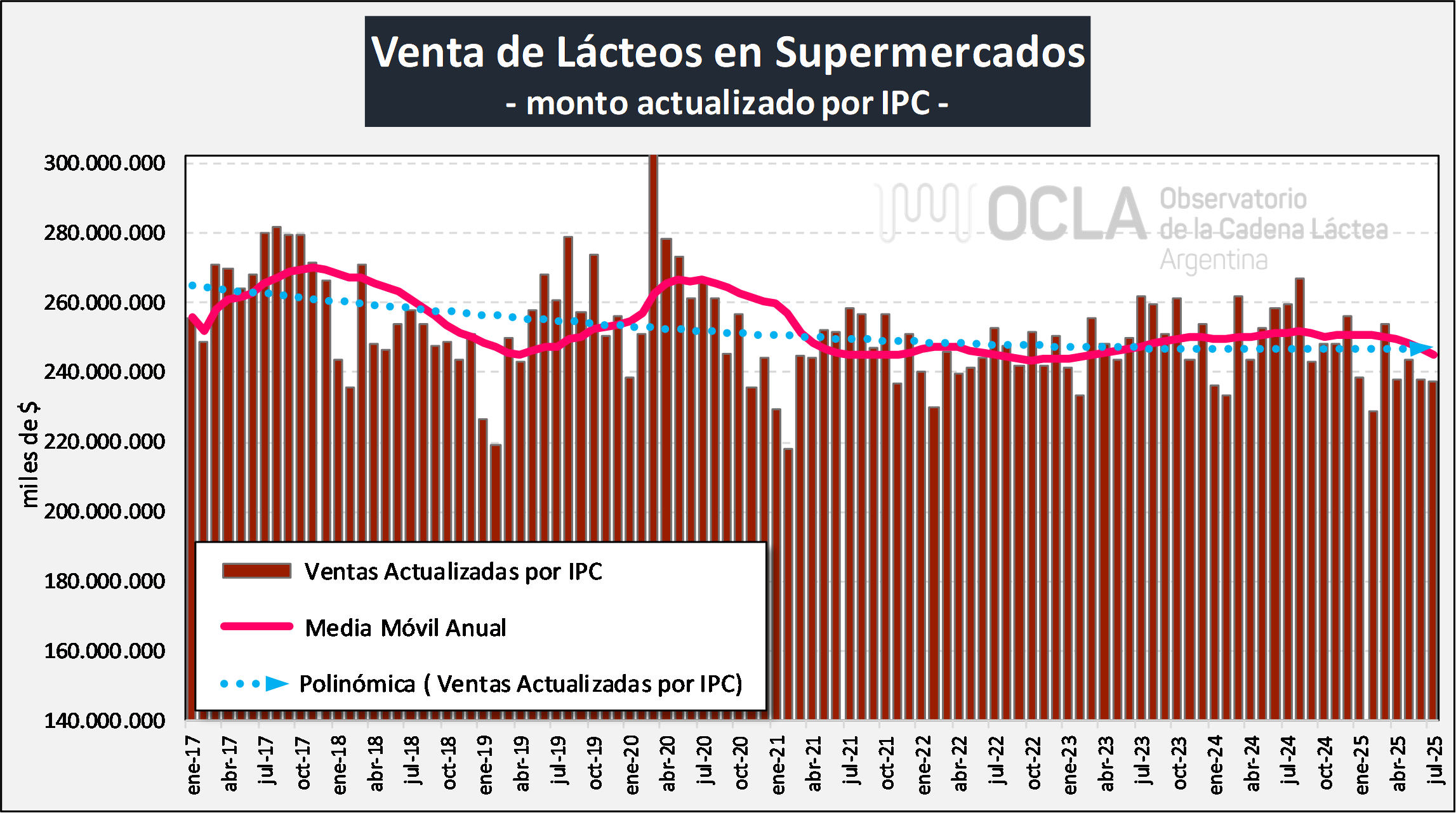 Encuesta de alcance nacional que incluye las cadenas que cuentan por lo menos con alguna boca de expendio con una superficie superior a los 300 metros cuadrados. Se realiza desde el año 1996 sobre una muestra de 68 empresas seleccionadas con 2.057 bocas de expendio y la periodicidad de la medición es mensual sobre el monto de ventas.