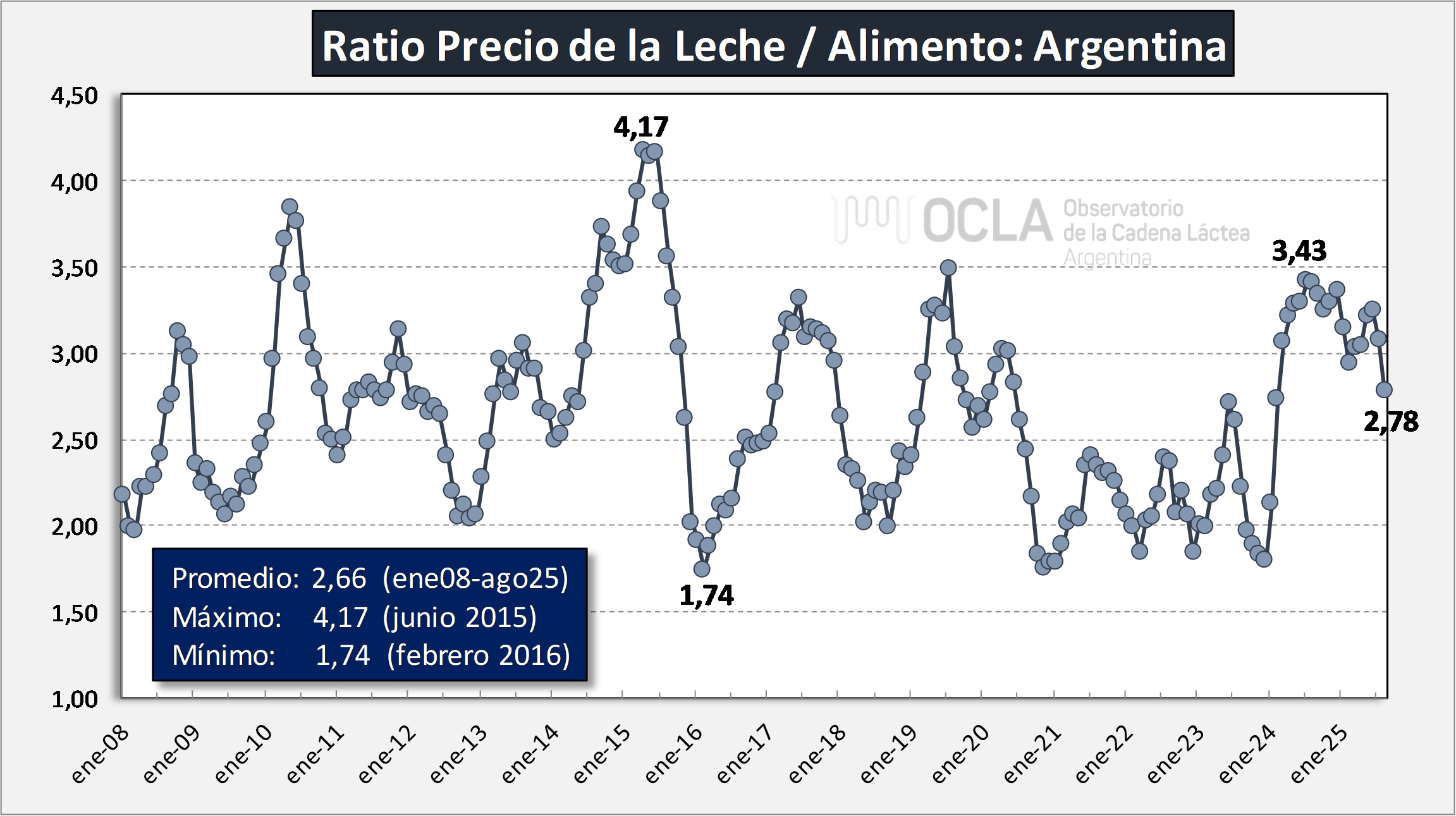 Se calcula como el cociente entre el precio de la leche al productor del Panel de 18 Empresas de la DNL-MAGyP y un vector de gastos que incluye alimentación suplementaria (concentrados y silaje) y el costo de oportunidad de la tierra, ya sea propia y/o alquilada. La inclusión de este último componente, que no existe en el modelo estadounidense, se realizó por dos razones. En primer lugar, en Argentina no está disponible un precio representativo de pasturas, alimento importante en la dieta del rodeo lechero. En segundo lugar, alrededor del 50% de la superficie tambera es alquilada, gasto que aplica al corto plazo en la economía de las empresas tamberas.