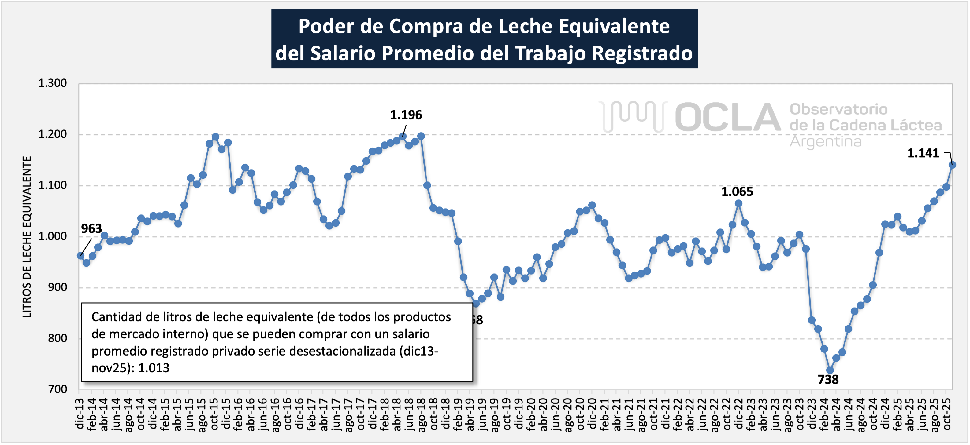 Sobre la base de los precios por litro de leche equivalente a consumidor final que mensualmente calcula IAPUCo y el Salario Promedio del Trabajo Registrado (desestacionalizado - excluyendo aguinaldo y otros conceptos estacionales)del Ministerio de Trabajo, Empleo y Seguridad Social; se calcula el poder de compra de leche equivalente para ese salario.