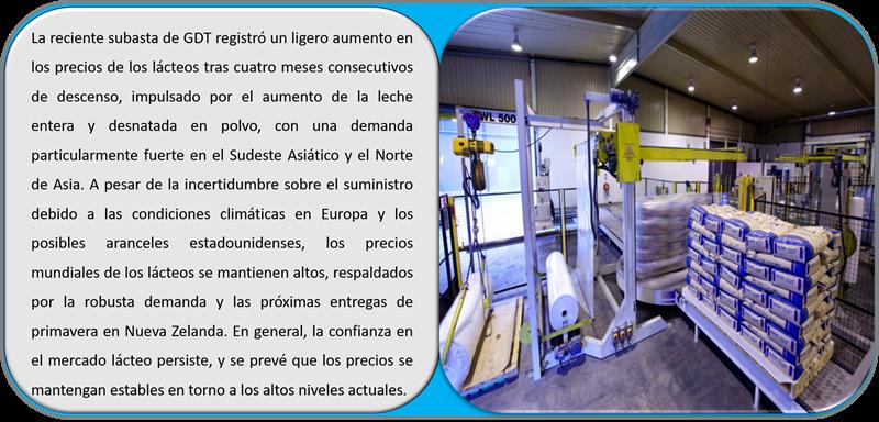 En la segunda subasta de julio, el índice de precios de GDT subió un 1,1%, impulsado por el aumento del 1,7% en los precios de la leche entera en polvo y del 2,5% en los de la leche en polvo descremada. La directora de lácteos de NZX, Cristina Alvarado, afirmó que el poder adquisitivo provino del Sudeste Asiático/Oceanía, donde la participación general en las compras de GDT aumentó un 25% hasta alcanzar el 34% en total, junto con la región del Norte de Asia, que alcanzó el 35%.