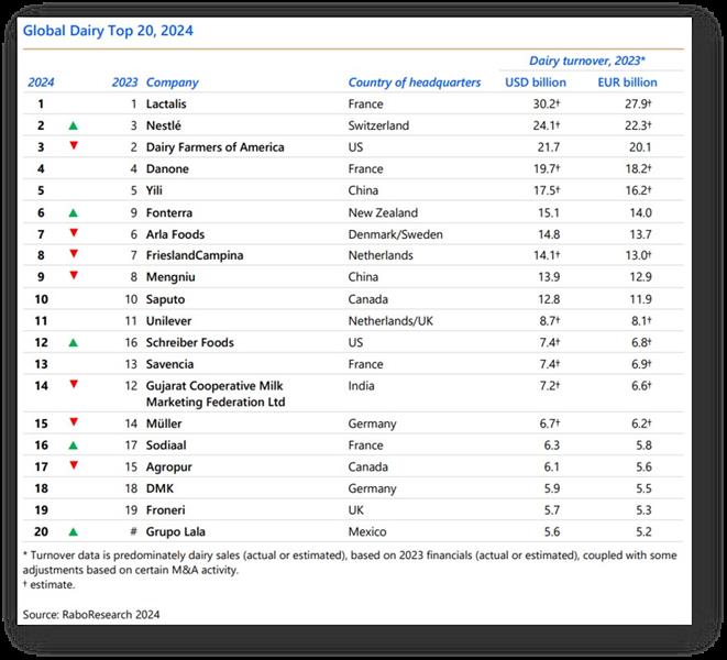 Solo 8 empresas mantuvieron la misma posición en la clasificación que el año pasado: Lactalis, encabezando la tabla con una facturación de 30,2 mil millones de dólares/27,9 mil millones de euros; Danone en cuarto lugar (19,7 mil millones de dólares/18,2 mil millones de euros); Yili en el quinto puesto (17,5 mil millones de dólares/16,2 mil millones de euros); Saputo en el décimo (12,8 mil millones de dólares/11,9 mil millones de euros); Unilever en el undécimo (8,7 mil millones de dólares/8,1 mil millones de euros), Savencia en el decimotercero (7,4 mil millones de dólares/6,9 mil millones de euros), DMK en el decimoctavo (5,9 mil millones de dólares/5,5 mil millones de euros) y Froneri en el decimonoveno (5,7 mil millones de dólares/5,3 mil millones de euros).