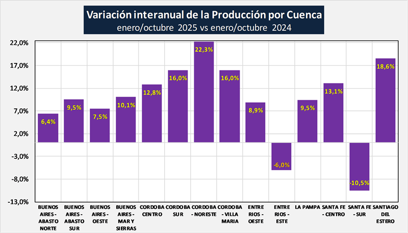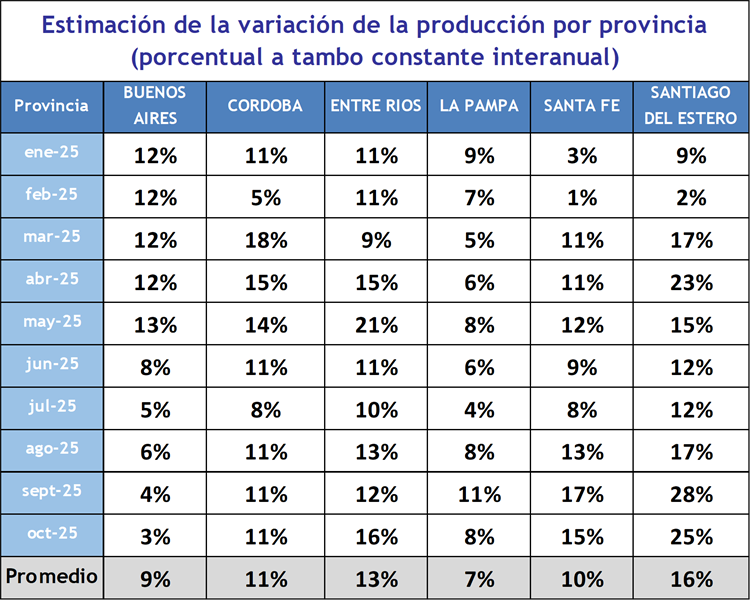Por último, el análisis de los diez meses transcurridos del año 2025 se realiza sobre las diferentes regiones productivas en función a la producción promedio por tambo (no tambo constante), donde también se observa una gran variabilidad atribuible a distintos factores.