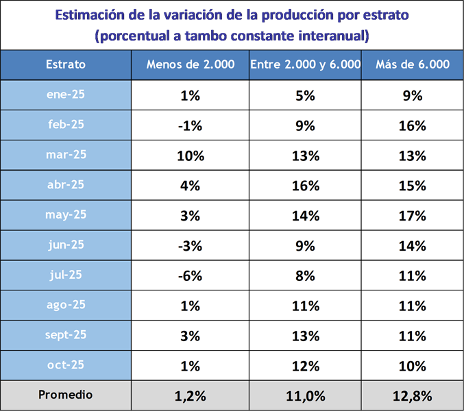 Si analizamos el comportamiento de la producción por estrato productivo, podemos observar que el estrato de más de 6.000 litros diarios de producción, tuvo un crecimiento interanual mayor que el resto de los estratos (12,8%), en enero-octubre de 2025. Por su parte los estratos, medio y bajo presentaron subas menores (11,0% y 1,2% respectivamente).
