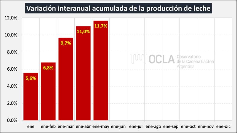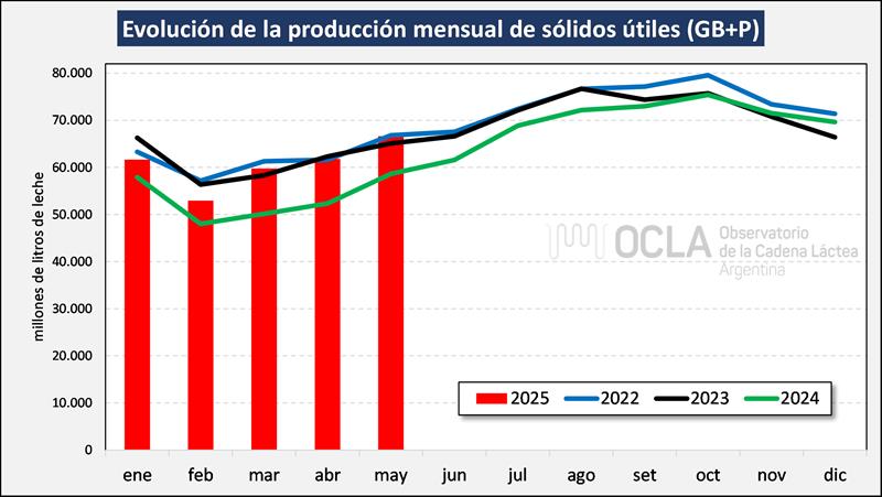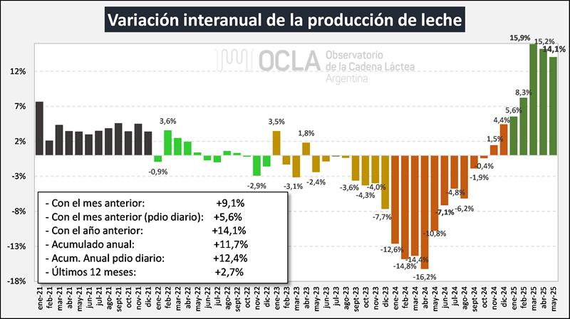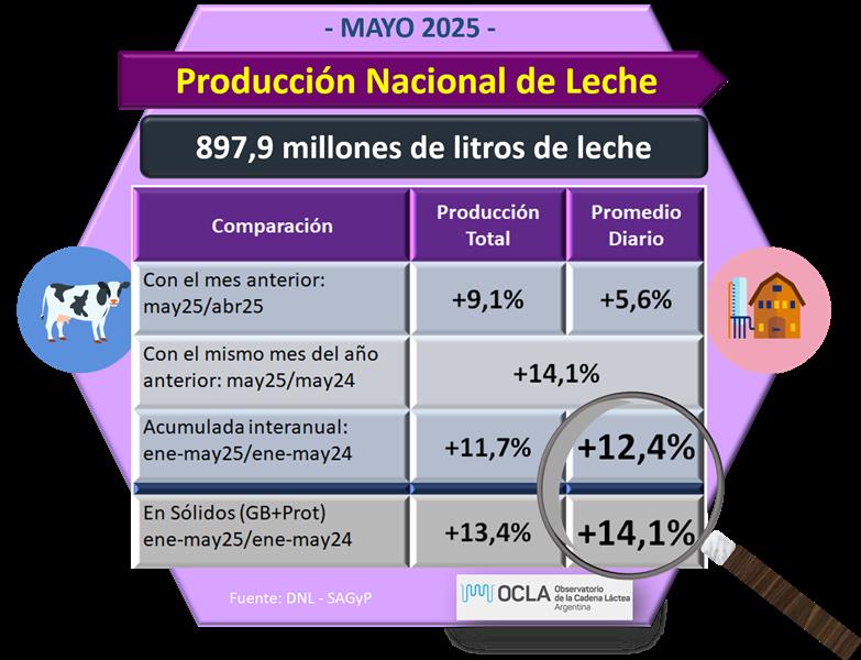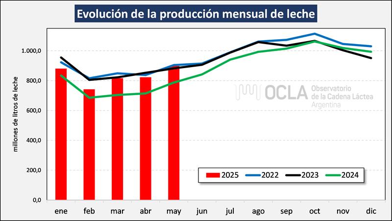 En el mes de mayo del 2025 la producción fue de 897.871.510 litros de leche, esto implica un valor 9,1% por encima del mes anterior (+5,6% en el promedio diario), un 14,1% más que igual mes del año anterior y el acumulado de los primeros cinco meses del año subió un 11,7% respecto al 2024 (+12,4% en el promedio diario).