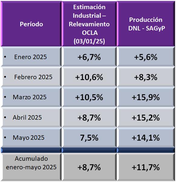 La estimación para el año 2025 en base a datos de la industria publicada por OCLA el 03/01/25 preveía un aumento del 5,7% (+6,0% en el promedio diario). Para el período enero-mayo esa estimación fue de +8,7%, superada con los números actuales ya que haciende a 11,7%.