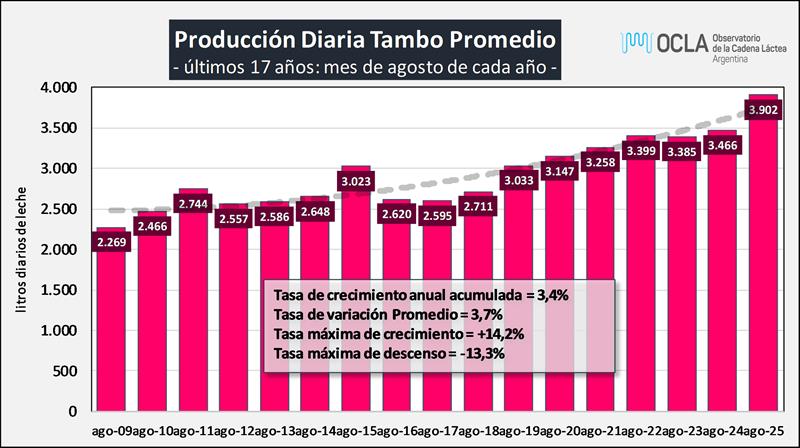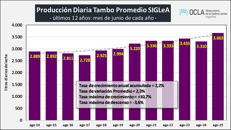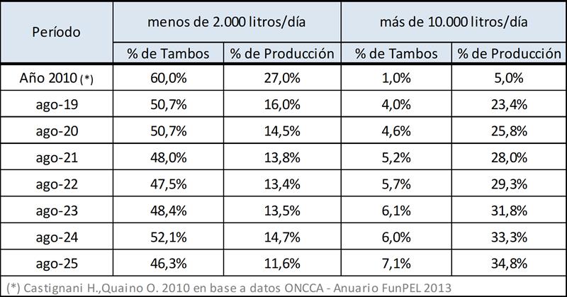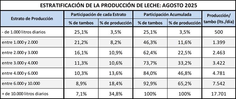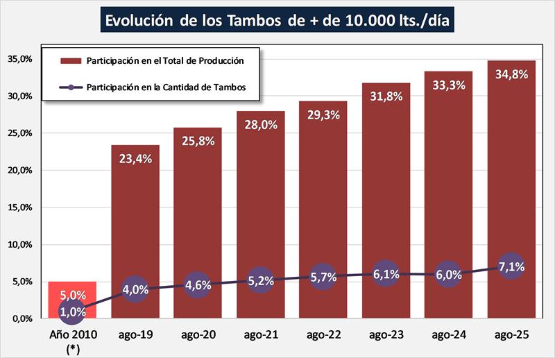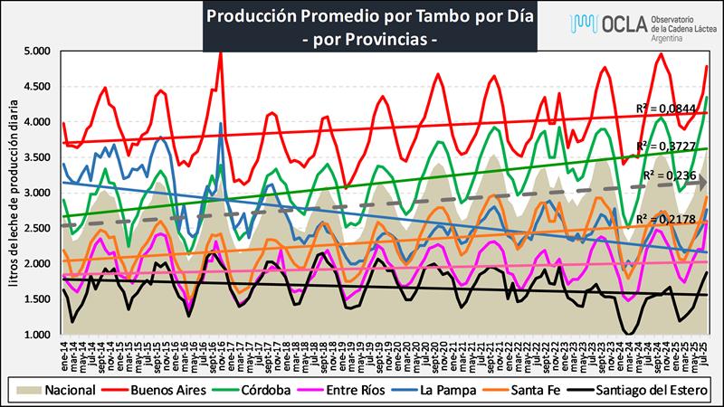 Estructura de la producción primaria – agosto 2025 17/9/2025![]() Estratificación de Tambos En el cuadro se presenta la participación de los tambos en función a su tamaño medido en litros de leche diarios del mes de agosto de 2025 sobre la base SIGLeA - LUME: ![]() Puede observarse que los algo más de 600 tambos del estrato de + de 10.000 litros de producción diaria, produjeron durante el mes de agosto un promedio de 17.701 litros diarios, representaron el 7,1% del total de tambos y aportaron el 34,8% de la producción total. Esto es bastante más de lo que aportaron los casi 4.200 tambos de menos de 2.000 litros diarios y que fueron el 46,3% de los tambos totales, que representaron el 11,6% de la producción nacional. ![]() Puede verse en el cuadro siguiente al comparar con datos disponibles del año 2010, que en un extremo viene disminuyendo la participación tanto en cantidad de tambos como en el volumen de producción de las unidades productivas de menos de 2.000 litros diarios y en el otro extremo de la estratificación, se incrementa la participación de las unidades de más de 10.000 litros diarios. Entre 2010 y 2025 los tambos de menos de 2.000 litros de producción diaria venían reduciendo significativamente su importancia relativa en la producción de leche total y los tambos de más de 10.000 litros diarios de producción, multiplicaron por 7 su participación en la producción y la cantidad de tambos, a pesar del efecto de caída de la producción total que se dio en 2024. ![]() En una a representación gráfica se puede observar de forma más contundente el crecimiento en participación de los tambos de + de 10.000 litros diarios de producción de leche: ![]() Como mencionamos arriba, se están reduciendo la cantidad de tambos como lo venimos indicando desde el inicio de nuestras publicaciones, y en base a la información disponible podemos deducir que la mayor reducción no se da mayoritariamente en los tambos más chicos (con una característica mayor de producción familiar y ubicados muchos de ellos en cuencas no tradicionales), sino en aquellos que superaron un volumen de 2.000 litros diarios, pero no llegan a convertirse en tambos de mayor escala por diferentes motivos: sucesión familiar, superficie, acceso al financiamiento, incorporación de tecnologías de insumos y procesos, etc. Por su parte, en el cuadro siguiente se puede ver la distribución de los tambos por provincia en base a su tamaño, y se puede concluir que los tambos más grandes están principalmente en Buenos Aires, seguido por Córdoba y el resto de provincia se caracteriza por una prevalencia de tambos de menos de 3.000 litros diarios. ![]() El Tambo Promedio Mensual Sobre la base de la producción mensual y la cantidad anual de tambos (SENASA), podemos inferir el tamaño del tambo promedio, unos 3.902 litros de leche diarios para agosto de 2024, una producción 12,5% superior al año anterior. En el período 2016-2025 el tambo promedio creció a una tasa del 5,2% anual. ![]() La serie de cantidad de tambos (SENASA) utilizada para los cálculos de la producción por tambo, es la única disponible y a pesar de conocer algunas falencias en el relevamiento de la información, el criterio se mantiene en el tiempo y nos permite evaluar la tendencia. En caso de existir una fuente de información mejor, obviamente no proveniente de estimaciones o supuestos, la incorporaremos en nuestro análisis. El Tambo Promedio SIGLeA – LUME, producción diaria al mes de agosto de cada año: ![]() En el gráfico de arriba se compara la evolución del tambo promedio mensual que se publica con la información surgida del SIGLeA – LUME en el Tablero de Comando Sectorial 2° Parte. El Tambo Promedio por Provincia SIGLeA – LUME, producción diaria últimos 12 meses ![]() La producción promedio diaria por tambo y por provincia que graficamos aquí es la que arrojan los datos de SIGLeA – LUME y se toma el promedio de los últimos 12 meses (septiembre/24 – agosto/25). Los datos SIGLeA – LUME del último mes provienen de 7.528 liquidaciones, 377 industrias lácteas. Por último, en el gráfico de abajo se muestra la tendencia en la evolución del tambo promedio nacional y por provincia, donde hay provincias como Córdoba con una importante tendencia al crecimiento (mayo R cuadrado), en la producción de sus unidades productivas, seguida por Santa Fe y luego el resto con una tendencia estable y un solo caso negativa. ![]() Todos estos gráficos y más en: https://www.ocla.org.ar/contents/newschart/portfolio/?categoryid=17 elaborado por el OCLA sobre información de la DNL-SAGyP y SENASA