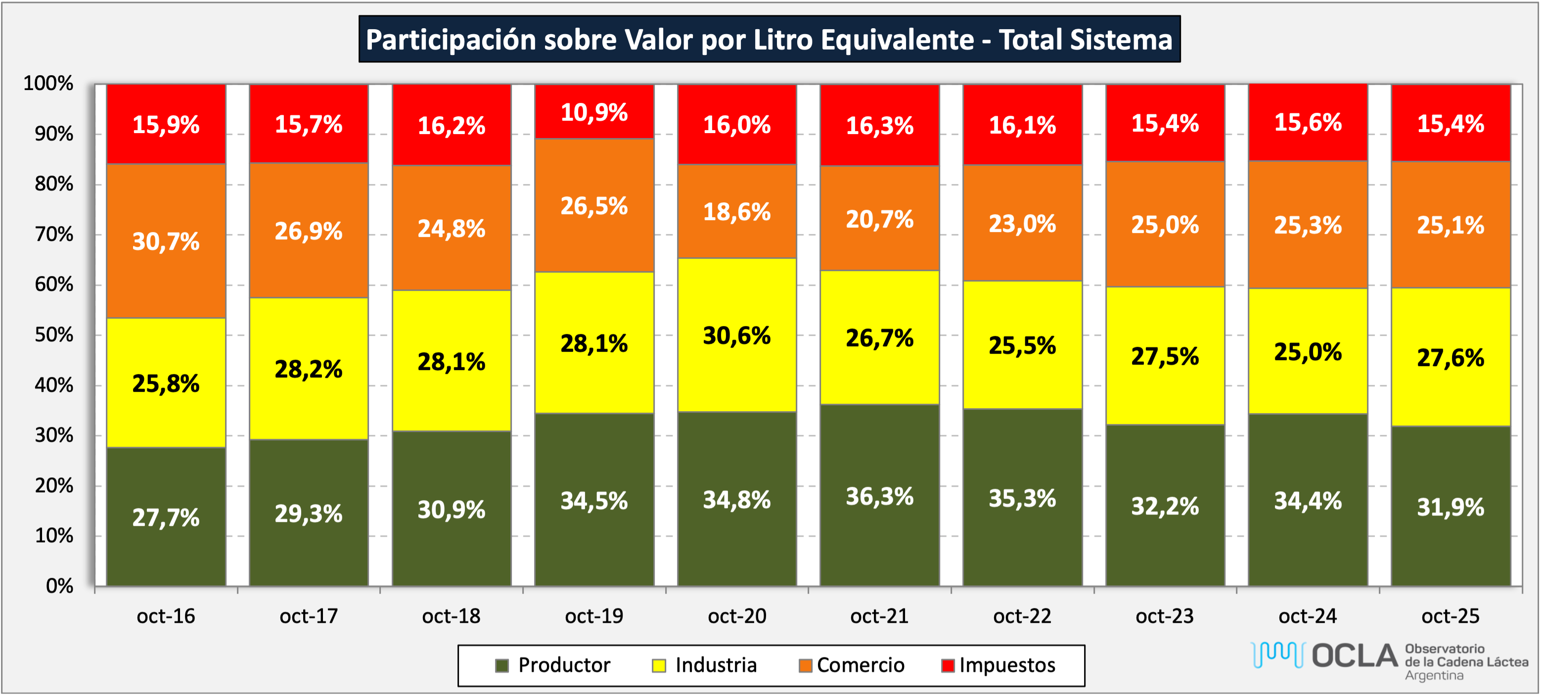 A partir de la idea de que el precio que paga un comprador expresa -de algún modo- el “valor” reconocido del bien que adquiere; el concepto de “valor por litro equivalente” (VLE) pretende exteriorizar el que le corresponde al “litro de leche cruda” en las diferentes etapas que lo convierten en un bien final de consumo. Las instancias en las que se practican las mediciones de precios son: Tranquera de productor, Planchada de industria, Consumidor final sin impuestos al consumo, Consumidor final (con impuestos al consumo). Dado que, excepto el que corresponde al de “tranquera productor”, los precios están referidos a unidades de productos diversos (quesos, leches fluidas, polvo, dulce, yogures, etc.) pero no en “litros de leche cruda”, el “VLE” traduce dichos precios en términos de los litros de leche empleados en su elaboración. La referencia “Total Sistema”, que se incluye en la información suministrada, refiere a la ponderación empleada para unificar los “VLE” de los diferentes productos en una única expresión que los contenga. La misma se realiza sobre la base del “mix” estimado del destino del total de los litros producidos y procesados. :