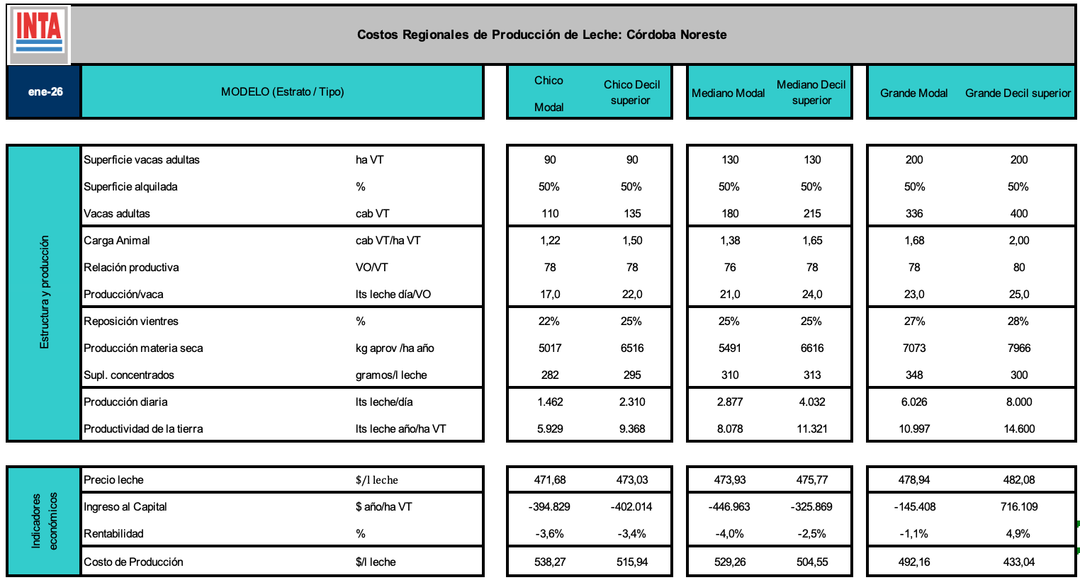 Los modelos se definen como representaciones simplificadas de la realidad. Partiendo de este concepto, en esta sección se presentan los costos de producción de leche asociados a modelos que reflejan a los sistemas productivos más frecuentes (modales) en las diferentes cuencas lecheras y para diferentes escalas de tamaño.Los mismos fueron construidos en talleres realizados con profesionales referentes de las diferentes regiones. Asimismo, se presentan los costos de producción de leche asociados a sistemas productivos reales del decil superior (10% superior en su resultado económico). En general, los costos presentan una alta dispersión respecto al valor modal,siendo sensibles a ciertas variables técnicas cuyas relaciones se presentan en los gráficos de correlación.