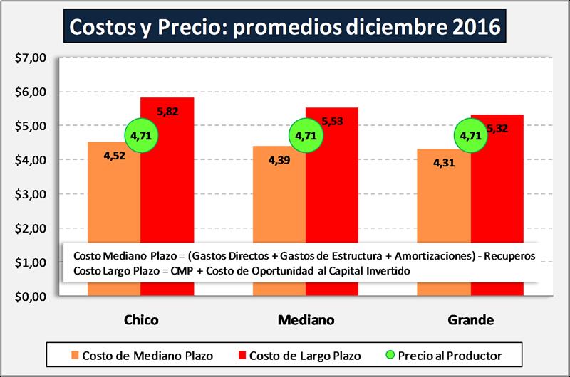 Analizando los Costos Regionalesde Producción para los tambos modales (sistemas productivos más frecuentes encada zona) que elabora mensualmente el INTA y comparando con el precio de la leche que publica la Sub Secretaría de Lechería (datos de las industrias), podemos ver que en términos general se cubren los costos de producción (gastos y amortizaciones), y que sólo en el estrato grande se logra acercar el precio al costo de largo plazo donde se incluye el costo de oportunidad al capital invertido.