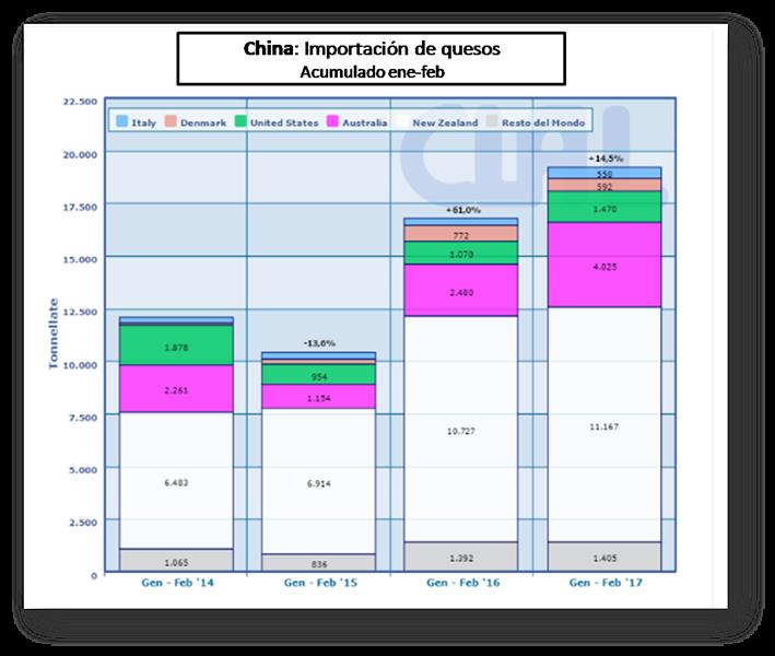 Las importaciones de productos lácteos de China se incrementaron significativamente en los dos primeros meses de 2017 respecto a igual período de 2016.