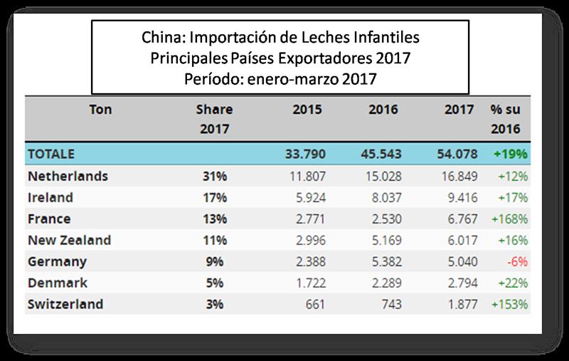eL creciente peso de Europa entre los exportadores de leche para los niños. En el período enero-marzo de 2017, la cuota de mercado de los Países Bajos, Irlanda, Francia, Alemania, Dinamarca y Suiza es del 78%, con un crecimiento significativo en Francia (+168%) y Suiza (+153%). Los mayores exportadores son Holanda e Irlanda, que en conjunto exportan más de 26.000 toneladas en el primer trimestre de 2017, lo que representa una cuota de mercado del 48%.