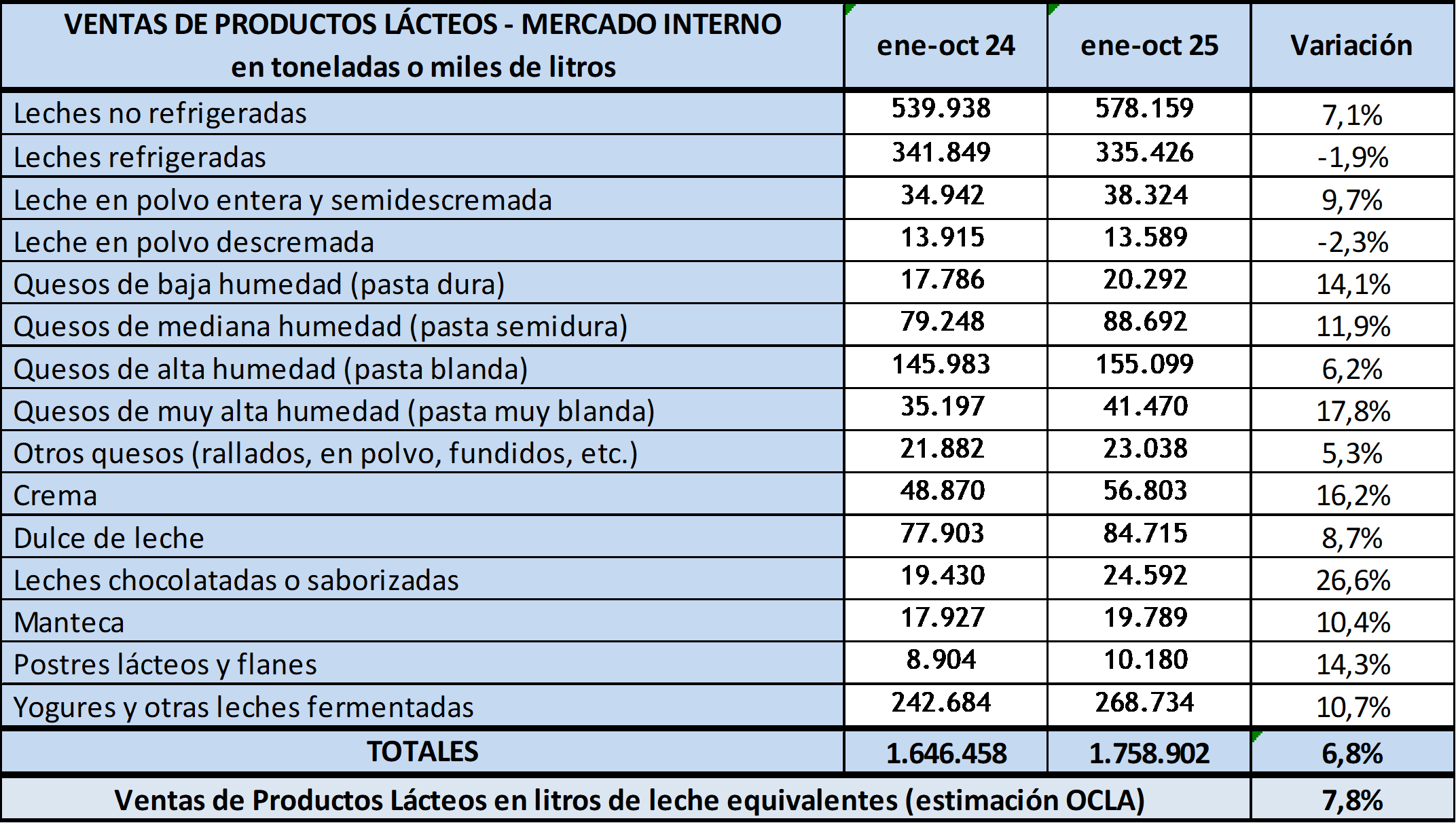 Los valores se expresan en toneladas y miles de litros, dependiendo del tipo de producto. La conversión a litros de leche equivalente se realiza con los coeficientes disponibles en OCLA.