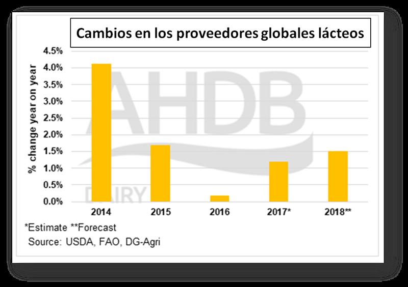 La producción de leche global crecerá en 2018 22/11/2017La producción de leche en los 5 principales exportadores de productos lácteos parece que aumentará el próximo año en un 1,5%, con lo que los suministros globales llegarán a los 289 mil millones de litros. Esto está en línea con el crecimiento del 1,7% de la FAO en el pronóstico del consumo de productos lácteos procesados para el próximo año. Se espera que la UE-28, el mayor productor, experimente un buen crecimiento, impulsado por el aumento de los precios de la leche y las mejoras en los rendimientos. Se espera que estos aumenten la producción en un 1,4% en 2018. Los mejores rendimientos también benefician a los EE. UU., con lo que se espera que la producción crezca un 1,8% en el nuevo año. Se pronostica que la producción de Nueva Zelanda crecerá 0.5% debido a un aumento esperado de 25.000 cabezas en el tamaño del rodeo lechero y un retorno a los patrones climáticos normales después de la primavera húmeda de este año. Se espera que las condiciones favorables para el crecimiento de los pastizales, los precios mejorados de la explotación agrícola y la reconstrucción de rebaños impulsen el crecimiento de la producción lechera australiana el próximo año, y el USDA espera un crecimiento del 2,2% después de dos años difíciles. La producción de Argentina sufrió bajo condiciones climáticas adversas y una alta inflación en 2017, lo que ha acelerado la concentración del sector primario y la eliminación de granjas más pequeñas del mercado. Tal vez reflejando la incertidumbre sobre el estado de la producción, hay pocas predicciones de producción para 2018 en Argentina. Sin embargo, la FAO ha estimado un crecimiento del 1.3% anual a mediano plazo a medida que el sector se recupera. ![]() traducido por el OCLA de AHDB Dairy