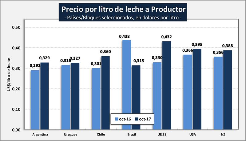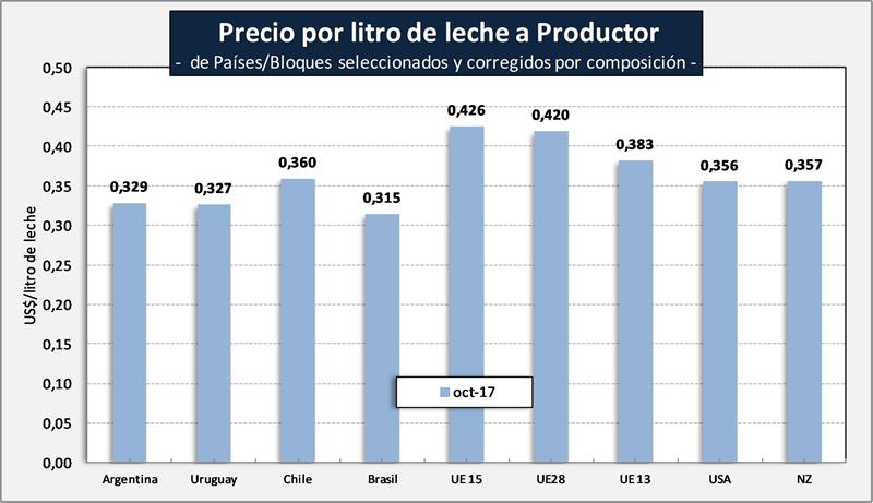 - El precio de la leche en Nueva Zelanda disminuyó en octubre a 33,00 centavos de euro por kg. (-1.5% en comparación con septiembre de 2017; + 2.2% en comparación con octubre de 2016).