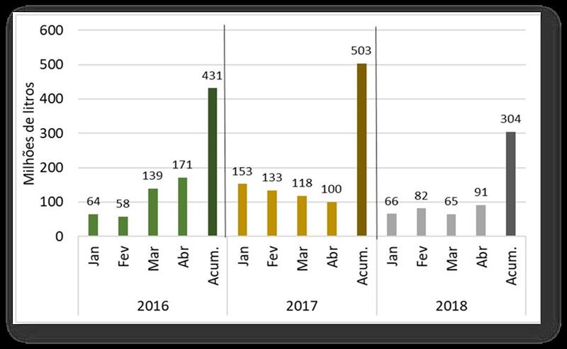 De acuerdo con los datos más recientes de la Secretaría de Comercio Exterior (Secex), en abril, Brasil importó un 39,9% más de leche en relación a marzo (91,2 millones de litros en equivalente de leche). Sin embargo, con las importaciones más "tímidas" a comienzos de año, el acumulado de los cuatro primeros meses de 2018 es inferior al volumen importado en el mismo período tanto de 2017 y de 2016 (-39,7% y -29,6% respectivamente), como muestra el gráfico 1.