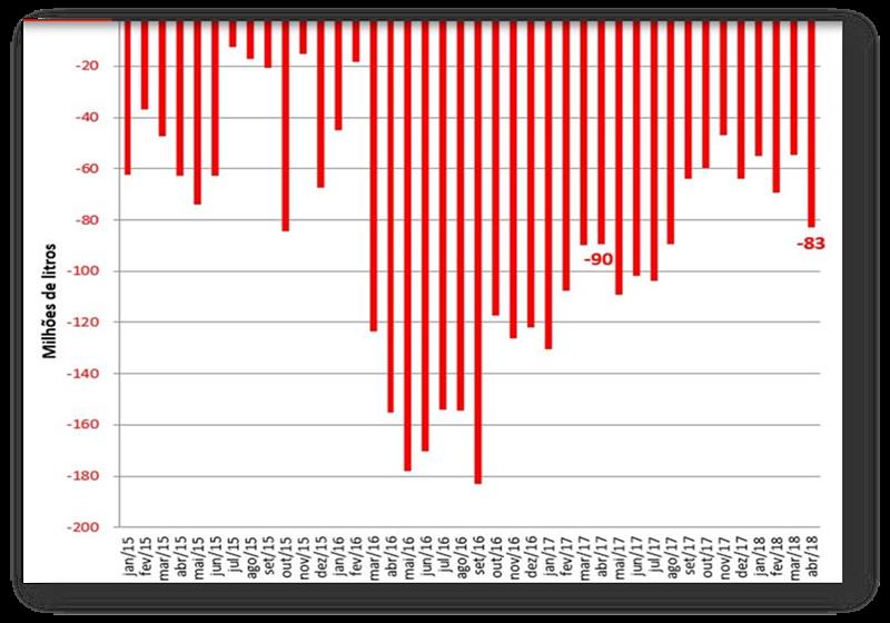 Con una mayor importación en relación a marzo y caída del 18,8% en las exportaciones, el saldo de la balanza comercial tuvo nueva caída, llegando a -83 millones de litros de leche, como muestra el gráfico.