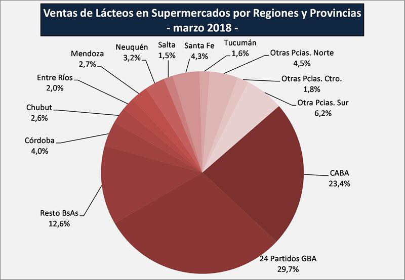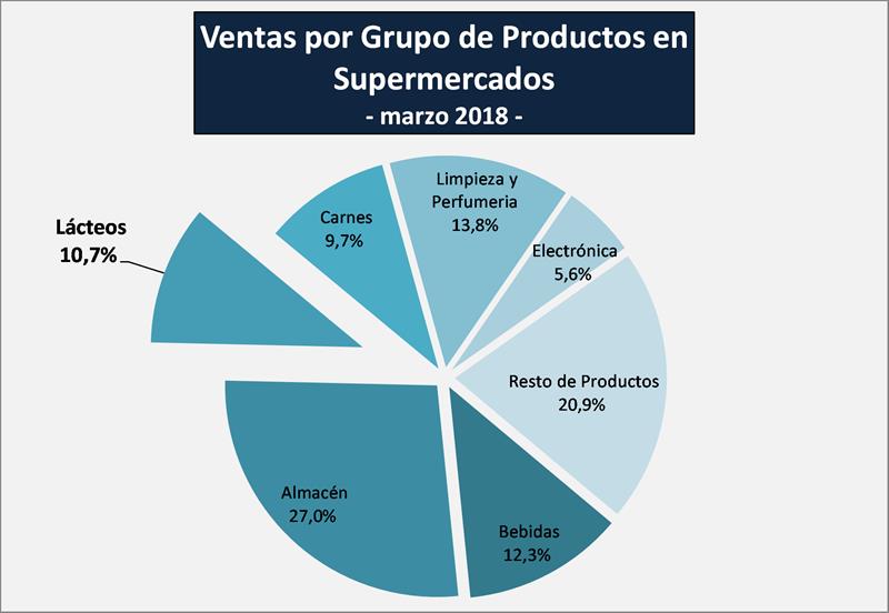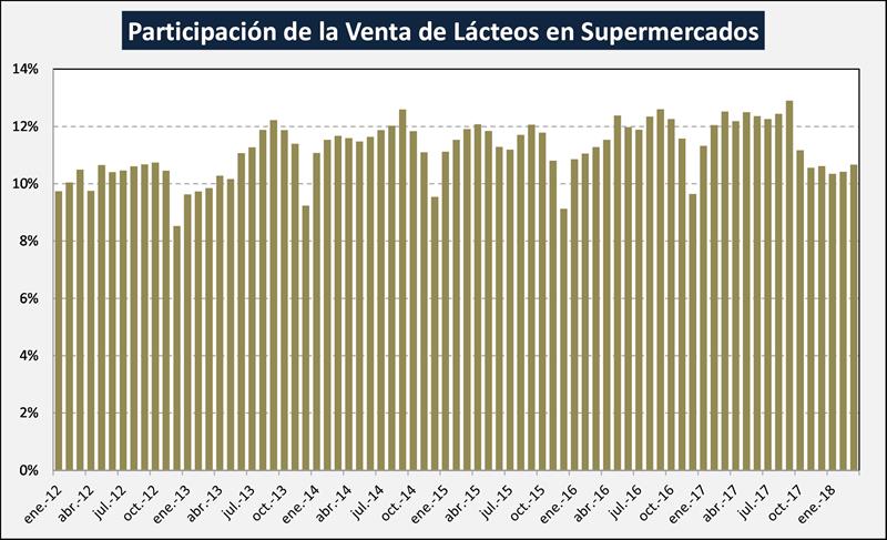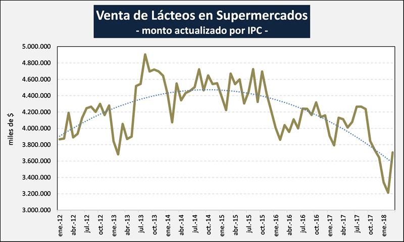 Venta de productos lácteos en supermercados 18/5/2018Ventas Totales de Supermercados a precios corrientes y a precios constantes Las ventas a precios corrientes para el mes de marzo de 2018 relevadas en la encuesta sumaron un total de 34.753,3 millones de pesos, lo que representa un aumento de 29,0% respecto al mismo mes del año anterior. Las ventas a precios constantes de abril de 2016, durante el mes de marzo de 2018, sumaron un total de 23.263,5 millones de pesos, lo que representa un aumento de 7,0% respecto a marzo de 2017. Lácteos ![]() Las ventas de lácteos en supermercados en el mes de marzo de 2018, fueron por un valor de $ 3.706,4 millones, lo que representa un incremento del 23,9% respecto al año anterior y lleva la participación en las ventas totales de los super a un 10,7%. Venta de Lácteos en las provincias ![]() Como puede observarse en el gráfico de arriba, la provincia de Buenos Aires incluyendo CABA y GBA representa el 65,7% de las ventas de los productos lácteos que realizan los supermercados en todo el país. Evolución de la Venta de Lácteos en Supermercados a precios constantes de marzo de 2018 ![]() Los valores de ventas de lácteos en los supermercados se actualizaron por el IPC San Luis empalmado con la serie de INDEC y vienen marcando una tendencia declinante, que como ya indicamos en otros informes había pasado a manos de los negocios mayoristas y de proximidad. En los últimos meses se observa una tendencia de recuperación de las ventas de lácteos en los supermercados, tanto en valor como en participación de mercado. Evolución de la participación de los lácteos en la venta de los supermercados ![]() Como indicáramos al principio la participación de los lácteos en marzo de 2018 llegó al 10,7% lo que implica una mejora relativa que tuvo su valor más bajo en enero 18 con el 10,3% que cuando se la desestacionaliza es una de las más bajas de los últimos 3 años. elaborado por el OCLA en base al Informe Técnico vol.2 n°94 – Encuesta de Supermercados – marzo 2018 - INDEC