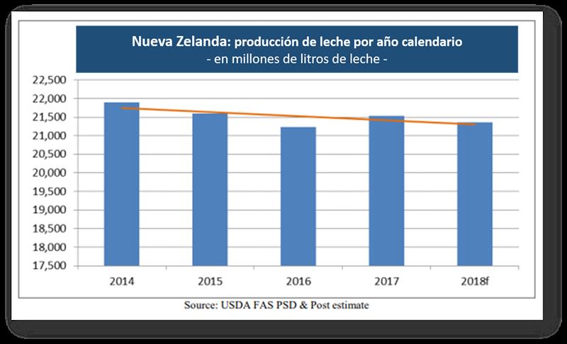 La producción de leche de Nueva Zelanda para 2018 se pronostica que continuará con una ligera tendencia a la baja en los últimos cuatro años, con 21.360 millones de litros, es decir un 0,8% por debajo de la producción del año pasado como resultado del bajo crecimiento de los pastos a principios de 2018 y menor números de vacas en la segunda mitad del año.
