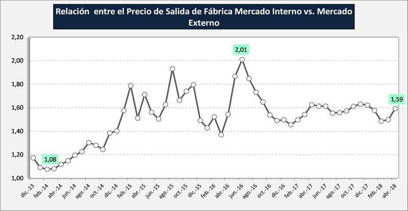El indicador para el mes de abril aún no favorecía el destino de exportación, ante el proceso devaluatorio es posible estimar (con los valores hoy disponibles), que los VLE respectivos para mayo 2018 estén en $ 13,60 para mercado interno y $ 9,94 para mercado externo con lo cual el indicador alcance un valor de 1,37 lo cual presentará atractivos para el destino de exportación.