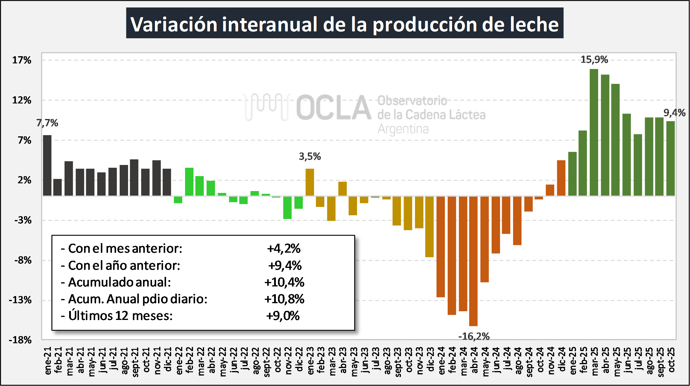 Producción nacional de leche cruda: se obtiene mensualmente agregando 9 bloques de datos primarios y/o calculados, representativos de distintos subsectores a nivel de industria o a nivel país: leche formal, leche decomisada, leche informal, tambos de terceros, tambos propios, pooles de leche, masa para muzzarella, provincias extra cuencas y leche no industrializada.