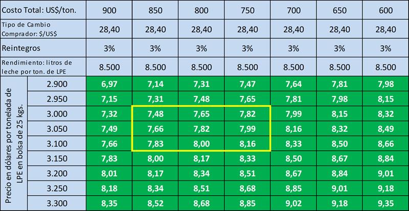 El cuadro de doble entrada tiene por un lado los valores de costos de elaboración y comercialización, el tipo de cambio, el reintegro de impuestos y la conversión de litros de leche a kilogramos de producto. Por otro lado el valor que se puede conseguir para la leche entera en polvo en dólares por tonelada bajo la posición mencionada.