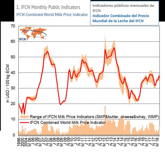 El Indicador combinado IFCN del Precio Mundial de la Leche ilustra el nivel de precios de leche en el mercado mundial. Representa el valor teórico que un procesador podría pagar a sus remitentes, comercializando sus productos en el mercado mundial y operando con costos industriales estándar.