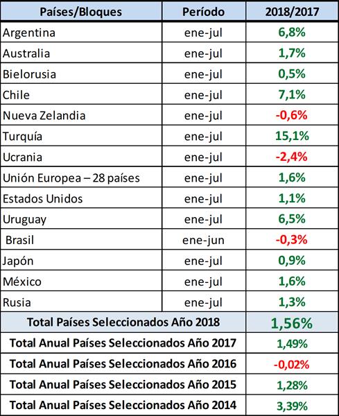 En el cuadro siguiente se toma un grupo seleccionado de los principales países productores e importadores que representan alrededor del 60% de la producción mundial de leche de vaca, en el cual se puede observar un crecimiento de la producción del 1,56%, para los primeros 7 meses del año 2018 respecto a igual período del año anterior. Cabe mencionar que se observa una leve desaceleración del crecimiento de la producción mundial de leche de vaca, ya que en los primeros meses del año, el crecimiento superaba el 2%.