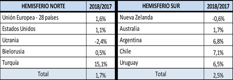 Continúa el crecimiento en USA y en la UE-28 (+1,1% y +1,6%, respectivamente) pero a menores tasas y NZ presenta una caída del 0,6%, caída que respondía en principio a cuestiones climáticas, pero se viene recuperando (había comenzado el año por encima del 3% de disminución de la producción). El comportamiento de la producción ponderada de ambos hemisferios, marca una mejor perfomance para el hemisferio sur, teniendo en cuenta que en los países seleccionados, el hemisferio sur es sólo el 15% de la producción de los países seleccionados del hemisferio norte.