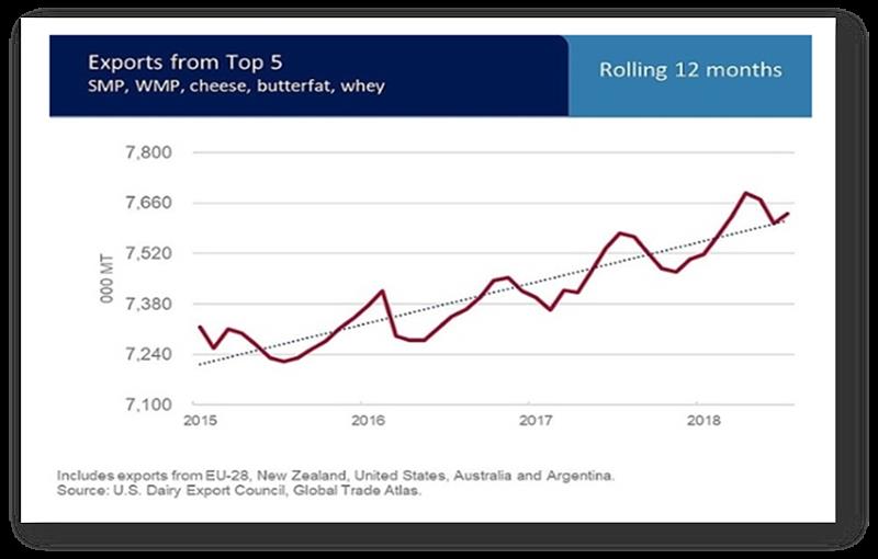 Por ejemplo, como herramienta abreviada para seguir las tendencias generales del comercio mundial de productos lácteos, calculamos las exportaciones de leche desnatada en polvo, leche entera en polvo, queso, grasa y productos lácteos de los cinco principales proveedores: la UE-28, Nueva Zelanda, Estados Unidos , Australia y Argentina. Estos proveedores y estos productos constituyen la gran mayoría del comercio mundial de productos lácteos.