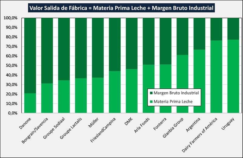 Para completar el análisis hemos adicionalmente corregido los precios a los estándares de calidad de la leche de Argentina. En el gráfico siguiente se distribuye el Valor de Salida de Fábrica, entre Materia Prima Leche y un Margen Bruto Industrial, que sería la parte destinada a los costos de elaboración, comercialización y rentabilidad, mostrando una cierta similitud entre los valores de materia prima leche (a pesar de la corrección Argentina sigue siendo el más bajo) y una gran diferencia en el margen bruto entre industrias/países.