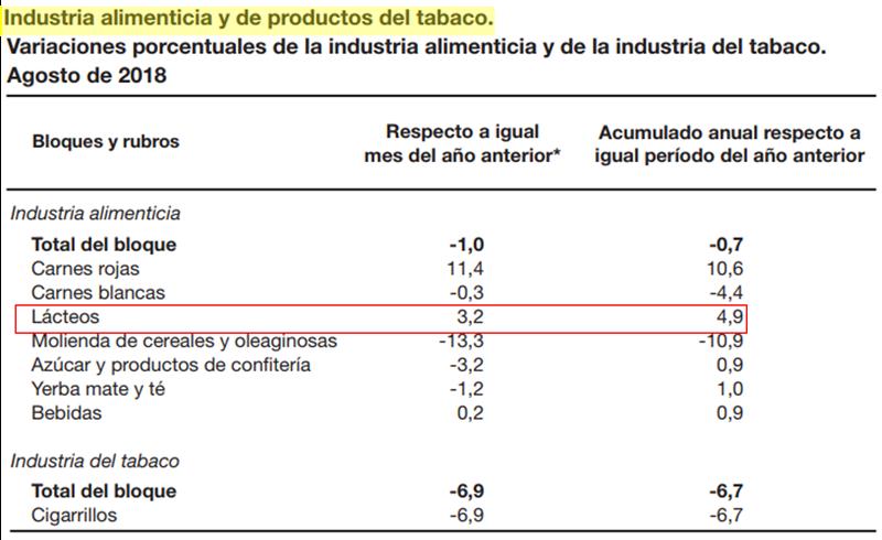 Los lácteos al igual que el segmento de las carnes rojas y menor medida las bebidas, son los que presentan valores positivos tanto respecto al mes anterior como en el acumulado anual. En el mes de agosto los lácteos crecieron en actividad un 3,2% y en los primeros 8 meses de 2018 respecto a igual período anterior el crecimiento fue del 4,9%.