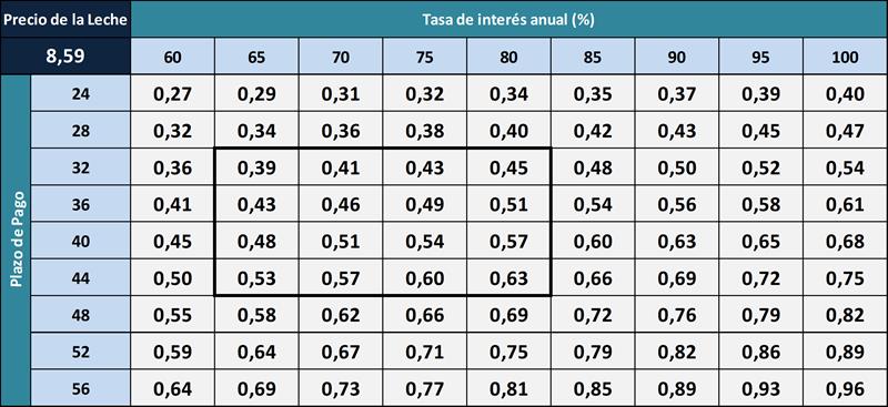 En forma vertical están los días ponderas de pago, y los valores que surgen dentro de la tabla son los $/litro de leche de costo financiero que implica la combinación tasa/plazo.