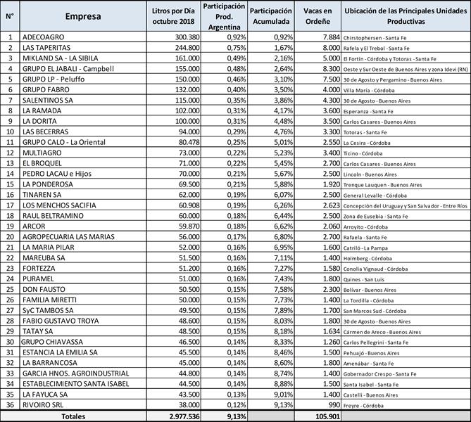 Cuáles son las 36 principales empresas o grupos lecheros de la República Argentina 6/12/2018El Ranking de Empresas Lecheras TodoAgro de octubre de 2018 quedó conformado de la siguiente manera: ![]() Nota: Información recopilada y generada por TodoAgro provista por productores, usinas lácteas y proveedores de los tambos. Producción correspondiente al mes de octubre de 2018. De las 36 empresas relevados por TodoAgro, que son los de mayor producción global en Argentina, 12 están en Santa Fe, 11 en Córdoba, 12 en la provincia de Buenos Aires, en tanto que Entre Ríos, la Pampa, San Luis y Río Negro suman 1 establecimientos en cada una de ellas. Cabe destacar que esta sumatoria supera a 36, habida cuenta que algunas empresas lecheras tienen tambos o unidades productivas en más de una provincia. extractado por el OCLA de información gentilmente cedida por TodoAgro – José. M. Iachetta