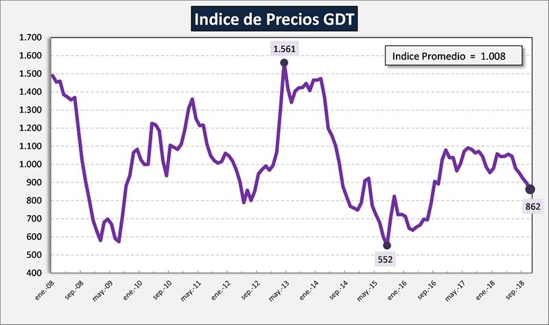 El índice de precios GDT mide el movimiento de todos los precios publicados para los productos vendidos en GDT, mientras que los índices de productos individuales describen el movimiento en los precios para un tipo de producto específico.