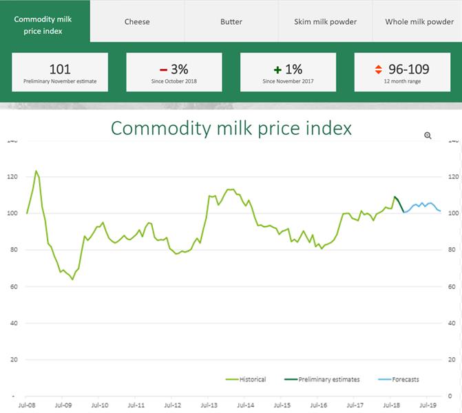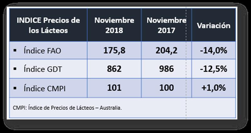 Indice de precios de los productos lácteos: se calcula sobre la base de los precios de la manteca, la leche descremada en polvo, la leche entera en polvo y el queso. La media se pondera por las cuotas medias de exportación de los últimos años.