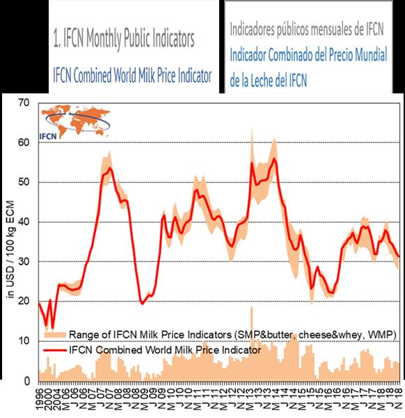 El Indicador combinado IFCN del Precio Mundial de la Leche ilustra el nivel de precios de leche en el mercado mundial. Representa el valor teórico que un procesador podría pagar a sus remitentes, comercializando sus productos en el mercado mundial y operando con costos industriales estándar.