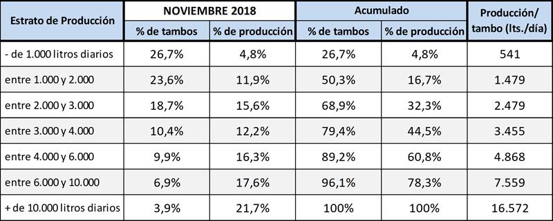 Puede observarse que los tambos de menos de 2.000 litros diarios de leche que representan el 50,3% de las unidades productivas, aportan el 16,7% de la leche total, y en el otro extremo los tambos de más de 10.000 litros diarios, que son sólo el 3,9% del total, aportan un volumen mayor de leche, el 21,7%. Los 416 tambos más grandes que producen un promedio de 16.572 litros diarios en promedio, aportan la misma cantidad de leche que 6.032 tambos más pequeños que producen en promedio, menos de 2.500 litros de leche por día.