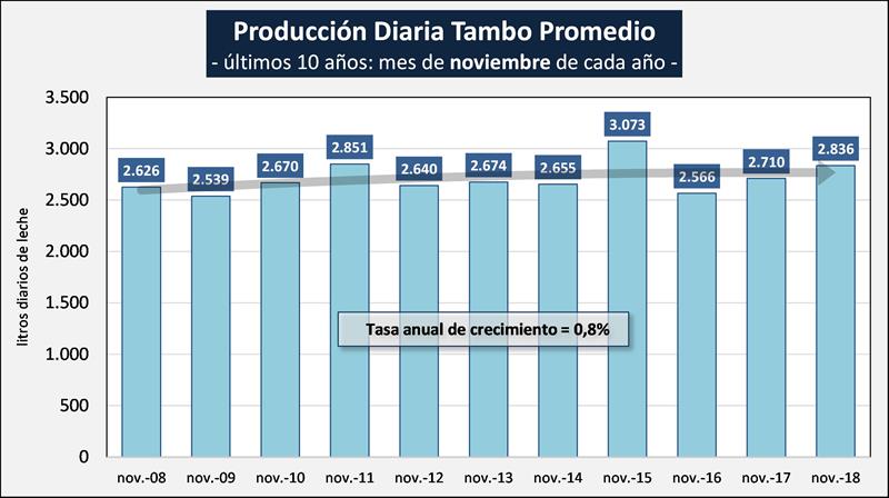 Sobre la base de la producción mensual y la cantidad anual de tambos, podemos inferir el tamaño del tambo promedio, unos 2.836 litros de leche diarios para noviembre de 2018, un 4,6% más que el año anterior (cabe acotar que la producción total interanual en noviembre, cayó un 0,9%). Si evaluamos su comportamiento en el tiempo, a pesar de la disminución en el número de unidades productivas y en el número de vacas, el tambo promedio presenta en el período 2008-2018 una tasa de crecimiento acumulada anual del 0,8%, lo que permite el sostenimiento de los niveles productivos agregados a nivel país.