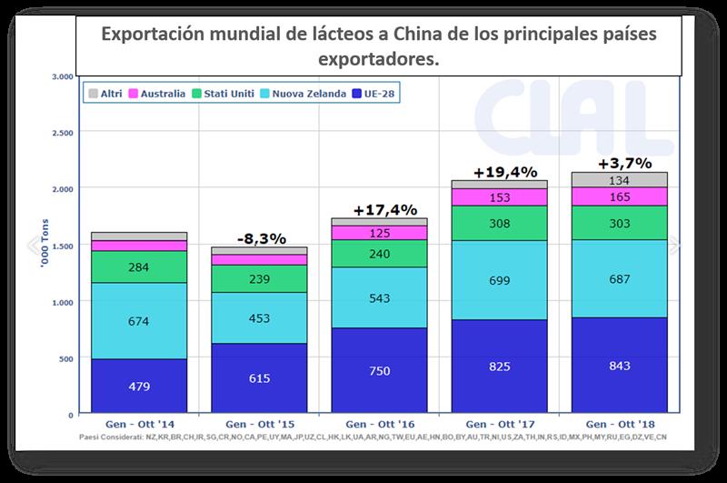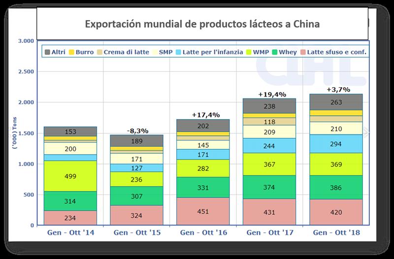 Tendencias positivas para la leche infantil (+ 20,3% en cantidad y + 8,8% en valor), con la Unión Europea que registró un crecimiento del 20% en los primeros 10 meses de 2018 y que solo representa el 78% de la cuota de mercado, seguido por Australia y Nueva Zelanda. Aumentos también para la manteca (+ 26,4% en cantidad y + 27,8% en valor), caseinatos, lactosa para uso farmacéutico y para uso alimentario.