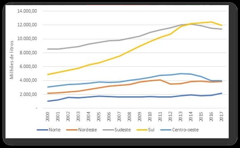 De 2000 a 2017, la región sur de Brasil tuvo un crecimiento fenomenal de producción, convirtiéndose en la mayor región productora, pasando al Sudeste, que tiene a Minas Gerais, con holgura el mayor estado productor de leche del país (gráfico 1).