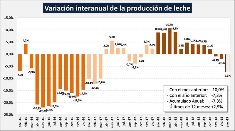 En el mes de enero de 2019 la producción fue de 819,9 millones de litros de leche, este valor representa una disminución del 10,0% respecto al mes anterior y una caída del 7,3% en comparación con igual mes del año anterior.