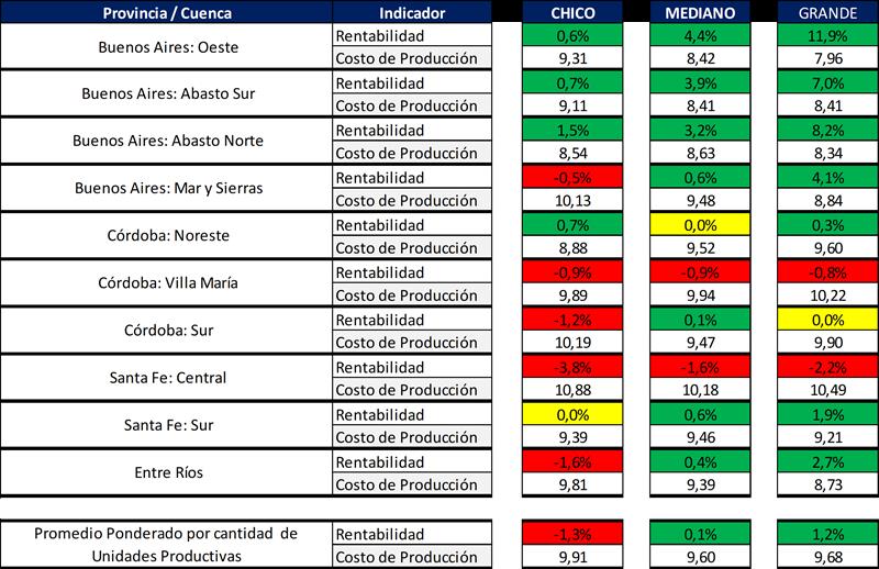 El valor medio de rentabilidad se pondera en función de la cantidad de unidades productivas (tambos) por provincia, por cuenca y por estrato, en base a la estratificación que surge de los tambos en el SIGLeA: