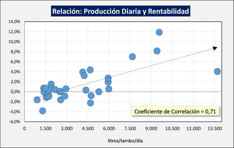 En el gráfico inferior, se relaciona el tamaño (medido en litros de leche producidos por día) y la tasa de rentabilidad, y como puede observarse el coeficiente de correlación es de 0,71, lo que indica que hay una relación directa y muy alta entre el tamaño del tambo (en este caso medida en litros diarios) y la tasa de rentabilidad al capital invertido.